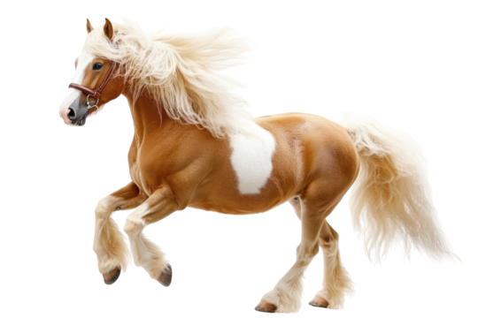 Majestic pinto horse with flowing mane isolated on transparent background. Elegant haflinger horse galloping isolated on white background.