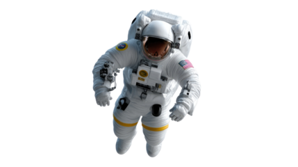 Astronaut in Space: An astronaut floats weightlessly, fully equipped in a pristine spacesuit, set against a blank canvas of the cosmos.