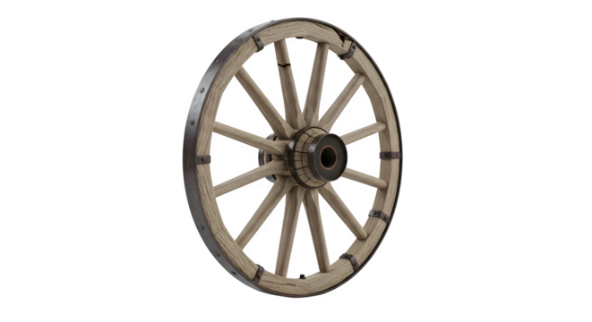 Vintage wooden wagon wheel isolated on transparent background, a rustic antique with spokes and a hub, reminiscent of historical transportation