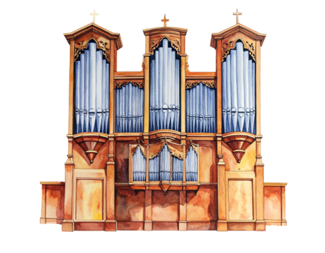 Watercolor depiction of an ornate pipe organ against a transparent background