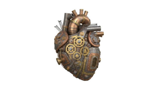 Detailed steampunk mechanical heart with visible gears, pipes, and springs is crafted from aged copper, brass, and steel in a complex industrial and retro-futuristic design