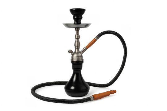 Brown wooden smoking pipe with silver accents and black stem isolated on a transparent background