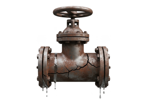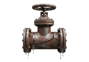 Rusty industrial valve, old metal pipeline with cracks and leaks, plumbing fixture, isolated on transparent background