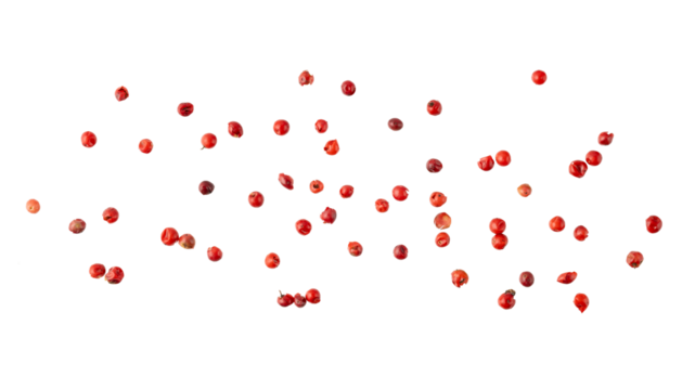 Pink peppercorn  pepperberry  flying isolated on white background. Aromatic spicy ingredient for cuisine.