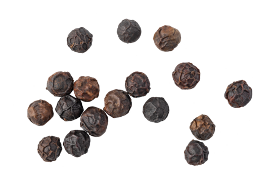 Dried whole seed of black pepper isolated on a transparent background without shadow seen from above, top view, png