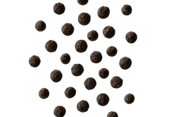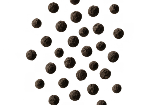 Whole black peppercorn in a close-up adding a pungent, spicy flavor to various cuisines, isolated on transparent background
