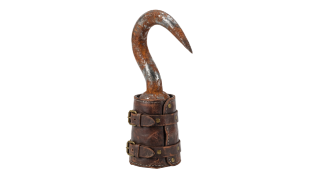 Realistic illustration of a weathered leather pirate hook with brass buckles against a dark background