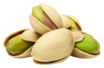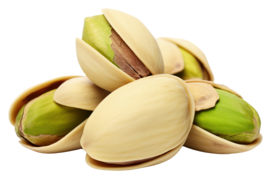 Close-up of pistachio nuts in their shells isolated on transparent background  vibrant color and natural texture