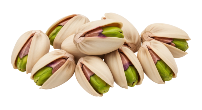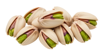 Three fresh pistachios with open shells reveal vibrant green nuts, perfectly isolated on a transparent background, high quality PNG file.