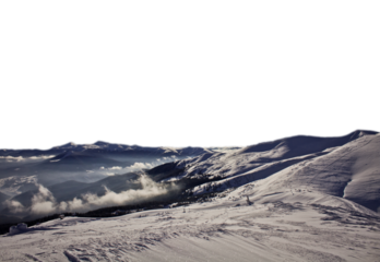 Ski slopes over clouds in wintertime isolated PNG photo with transparent background. High quality cut out scene element. Realistic image overlay for website design, layout, social media