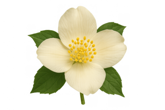 Jasmine flower blooming with green leaves, fresh white petals and yellow pistils, isolated on transparent background