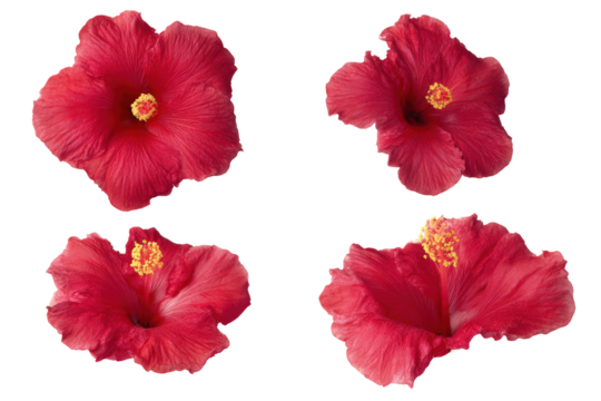Lush display of red hibiscus flowers with detailed pistils and leaves