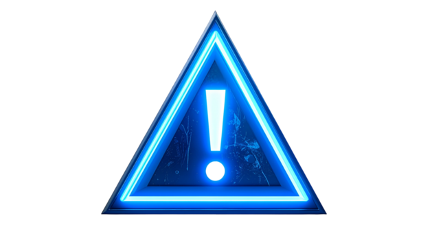 Illuminated blue warning symbol against a black backdrop, featuring an exclamation point within a neon-lined triangle