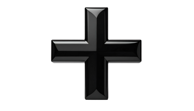 Glossy, black plus sign with beveled edges on a dark, isolated background