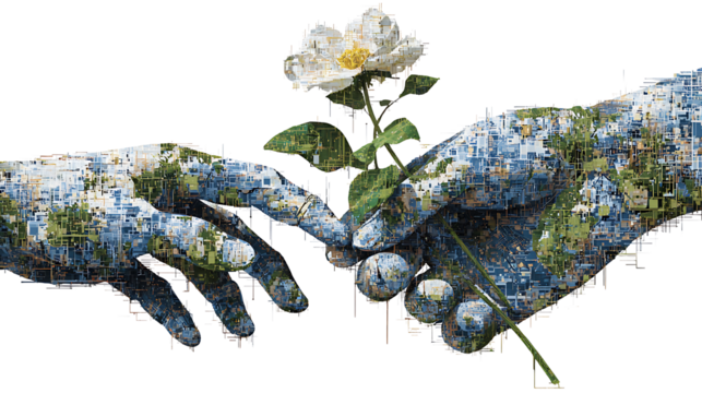 Hand holding a green leaf with digital pixel transition, symbolizing nature and technology, isolated on a transparent background