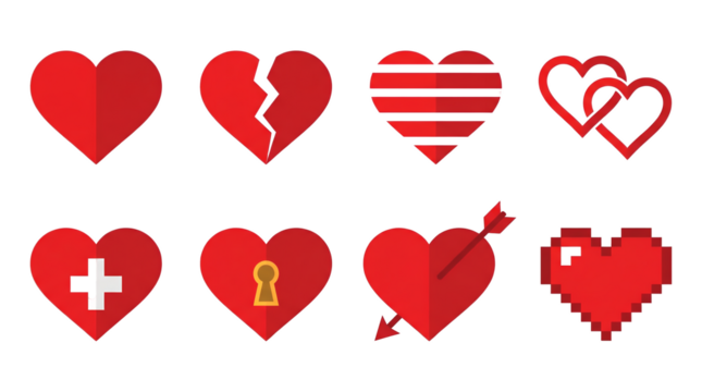 Red heart set including solid, broken, striped, interlocking, medical, locked, pierced, and pixel variants. Romantic love and valentine symbol collection.