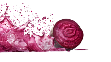 A sliced beet with juice splashing and pixelating on a transparent background in a studio shot