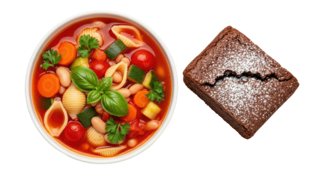 Overhead View of Minestrone Soup with Pasta Vegetables and Fresh Basil Alongside a Powdered Sugar Dusted Brownie on Transparent Background