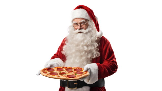 Santa Claus holding a pizza on Christmas isolated on transparent background