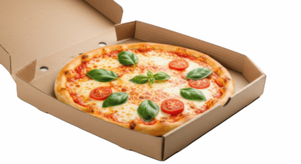 Fresh Margherita Pizza in Cardboard Delivery Box Isolated on Transparent PNG Background