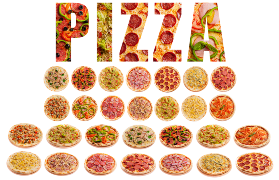 Set of pizza isolated top and side view and the textured word "PIZZA". Pizza photo for for menu card, web design, site, shop, advertising or delivery fast food.