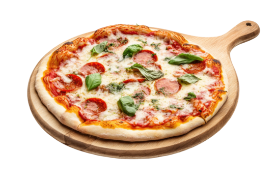 A beautifully assembled Neapolitan pizza placed on a rustic wooden pizza peel, on a transparent background.