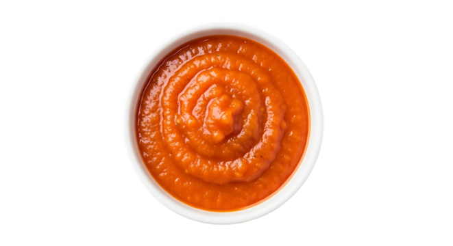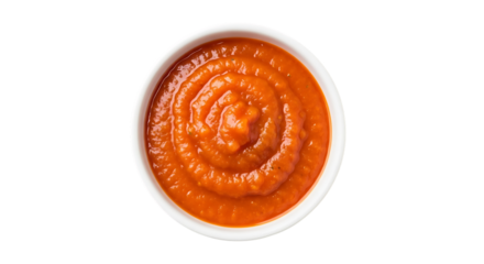 Tomato sauce in white bowl overhead view isolated on transparent background