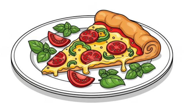 Cartoon Pizza Slice With Melted Cheese Tomatoes And Basil