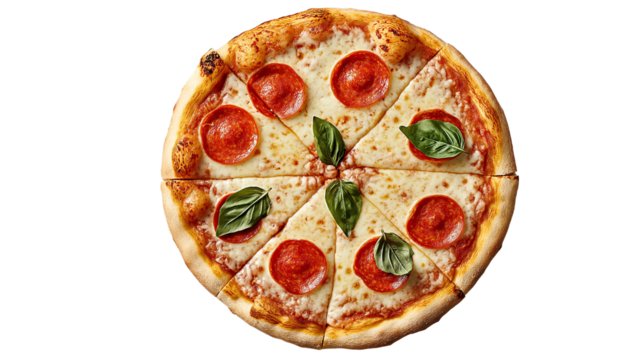 Savoring a delicious pepperoni pizza fresh from the oven with a crispy crust and bubbling cheese at a cozy pizzeria on transparent background