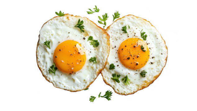A close-up view of two perfectly cooked sunny-side-up eggs garnished with fresh parsley. placed on a clean white surface. ideal for breakfast recipes or culinary presentations