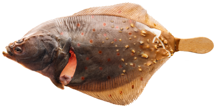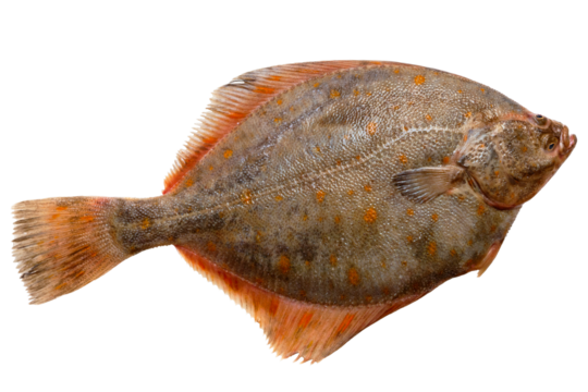 Whole raw european flounder or plaice, a flatfish with distinctive orange spots and mottled camouflage pattern, isolated on transparent background for culinary use
