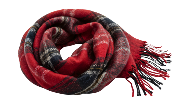 Red plaid woolen scarf with fringes rolled up isolated on the transparent background, winter fashion accessory, cozy warm textiles for cold weather outfits