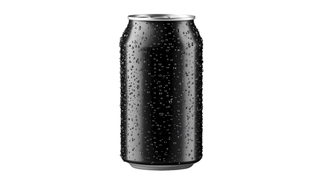 A close up of a black soda can with water droplets on it   in a studio shot isolated on transparent background