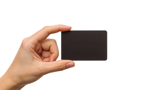 Hand holding a dark, rectangular card. Close-up of fingers. isolated on white background, png.