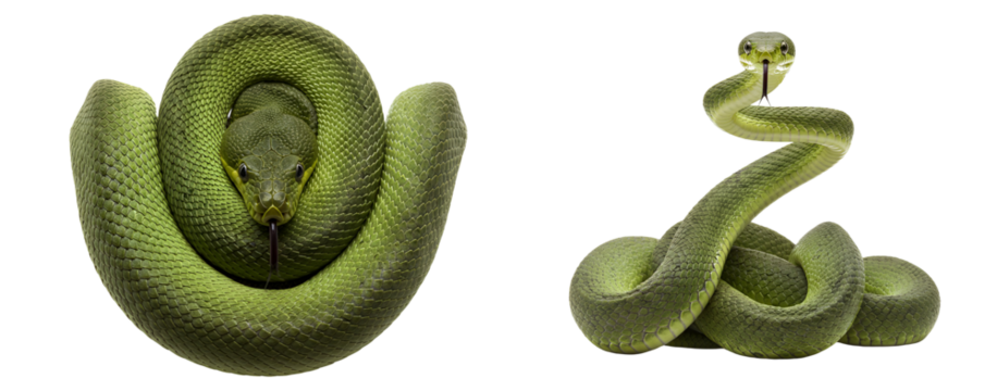 Two green snakes coiled and upright against a plain white backdrop transparent background
