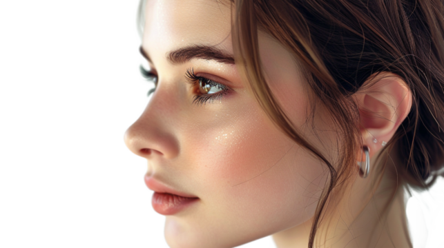 A serene and elegant woman's profile close-up with subtle makeup and brown hair pulled back, showcasing her facial features against a plain white background