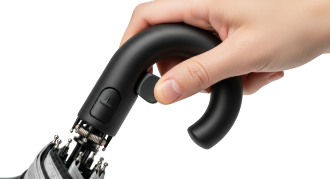 Hand holding a black umbrella handle against a white background.
