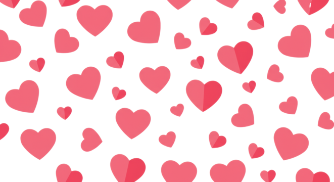 Numerous stylized, flat, two-dimensional pink hearts of various sizes and orientations, against a pristine transparent background, forming a seamless tileable pattern, concept for love and celebration