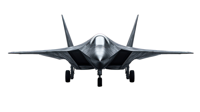 Stealth jet aircraft, front view, dark background, angular design