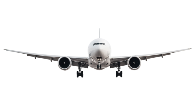 Commercial passenger jet with two jet engines in flight, visible from a corner front view, isolated on a transparent background, perfect for use in promotional materials and education.
