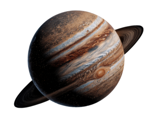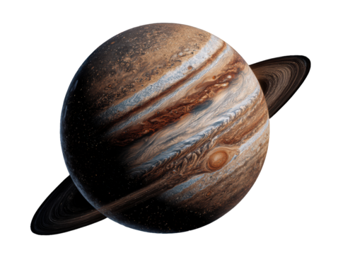 Saturn, a ringed gas giant, orbiting a star in the solar system, presented as a 3d render with a transparent background