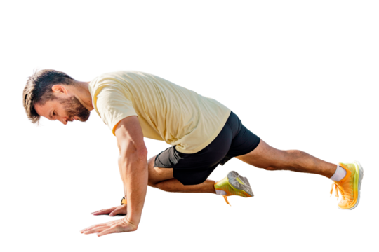 Warm-up for the body cardio.  Plank exercises intensive training fitness strong man. A happy man sports a slim body.  Mental and psychological health. Transparent background.