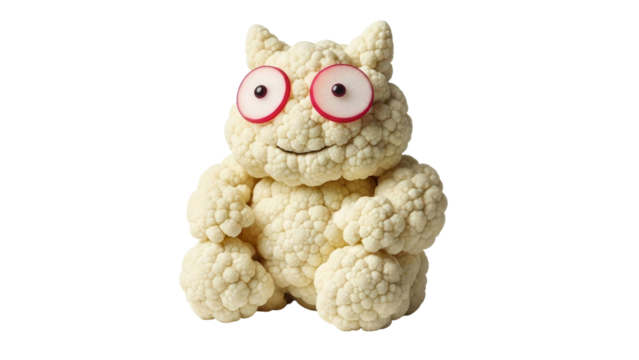 Cute cauliflower monster with radish eyes smiles, cut out, stock png, isolated on transparent background
