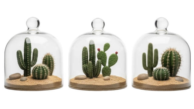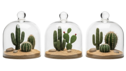 Isolated botanical arrangements of cacti plants inside glass domes, natural decor elements