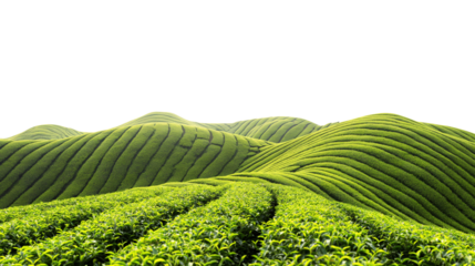 Picturesque tea plantation with rows of green bushes, isolated on white background