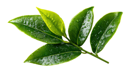 Fresh green leaves with water droplets on a white isolated background.