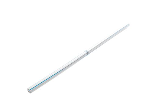 A white plastic tube with blue stripes, lying at an angle, isolated on black
