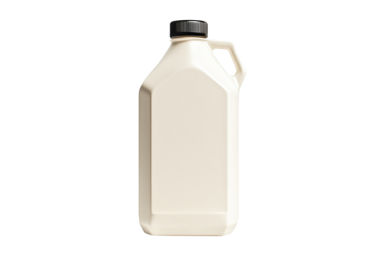 White plastic milk bottle with cap isolated on white background. Concept of packaging, storage, and container design.