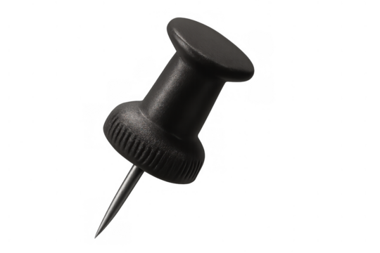 Single black pushpin creating focus, holding content, and highlighting important information on transparent background