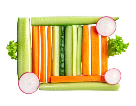 Minimalist Line-Up of Cucumber, Carrot Sticks, and Radish Halves, Isolated on Transparent PNG Background